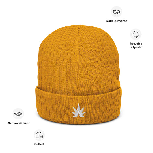 White Cannabis Leaf Organic Ribbed Beanie